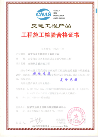 泰安智能电子是一家专业做交通信号机、信号灯杆、交通标志牌的生产商,一直以来公司以以人为本、务实、高效、创新的管理理念,以信誉第一 、用户至上的宗旨,为社会提供着优质的产品和服务,经过不懈的努力,我公司取得了国家交通安全设施质量监督检验中心的认可,为我公司颁发了交通标志牌安装工程合格证书!